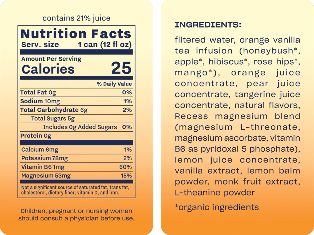 sparkling water infused with magnesium & balancing adaptogens. juicy orange, creamy vanilla & a hint of nostalgia