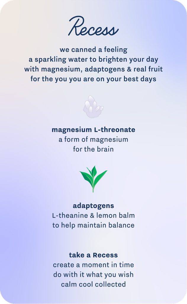 the original Mood samplersparkling water infused with magnesium and balancing adaptogens in our four original flavors Loading... More + Loading...functional ingredients you can feelmade with real ingredients, uplifting guayusa & balancing adaptogens. Recess Zero Proof is the perfect alcohol alternative
