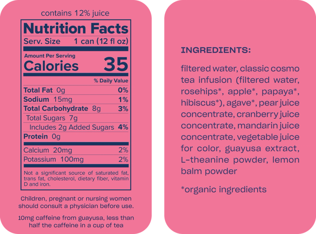 a cosmo for alcohol-free moments, with refreshing cranberry & lime juice. infused with uplifting guayusa & balancing adaptogens. a mocktail with benefits - lightly sparkling, low calorie, and way less sugar than a cocktail