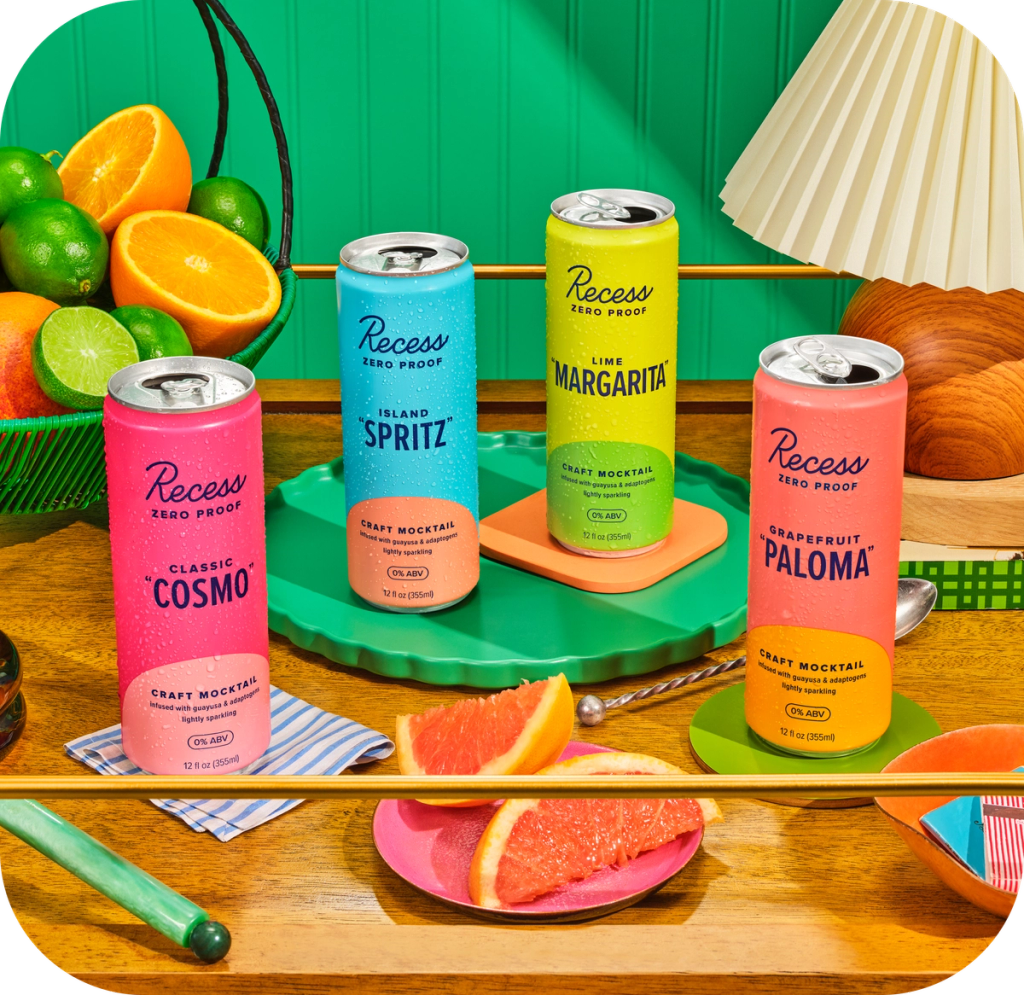 made with real ingredients, uplifting guayusa & balancing adaptogens, Recess Zero Proof is the perfect alcohol alternative